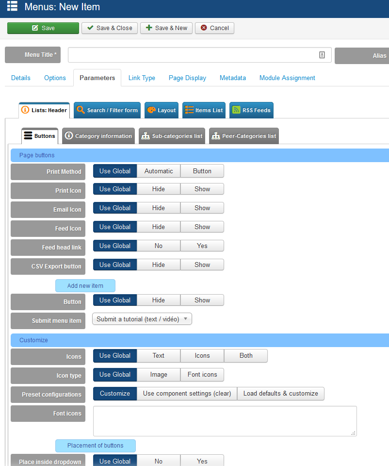 Je suis parti sur Système > Configuration > FLEXIcontent > onglet Default menus. Là, j'ai par exemple sous "Category-based views" une rubrique Tagged items, mais que je ne peux pas modifier (grisée). Je ne pense pas être au bon endroit, mais alors c'est où ?