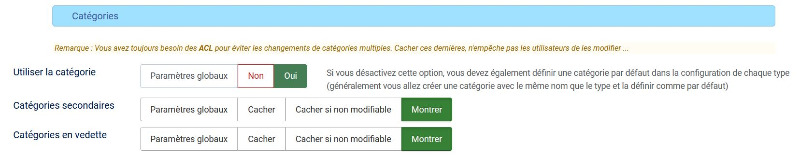 2 - dans la configuration générale, voici ce que j'ai paramétré pour le formulaire de saisie, formulaire de contenu public et formulaire de contenu administration concernant les catégories :