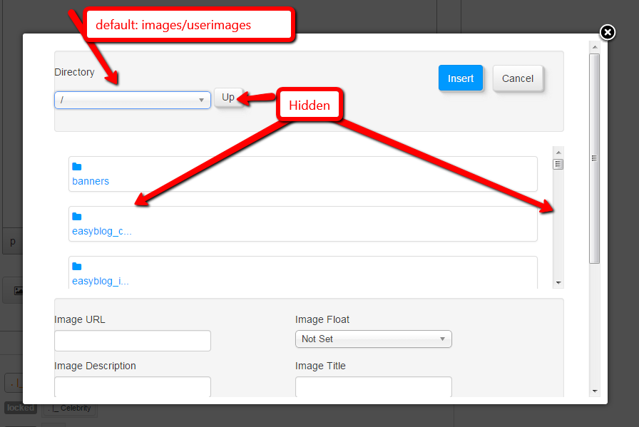 i would kindly ask if somebody can advice me how to hide folder list on ADD form (front end), to force the users to use only one directory (e.g. /images/userimages), this solution does not allow users to see other admin joomla images.