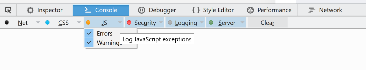 2. click CTRL-SHIFT-K, and select the 2nd TAB "console", the sub-option "JS" should be enabled (see picture)