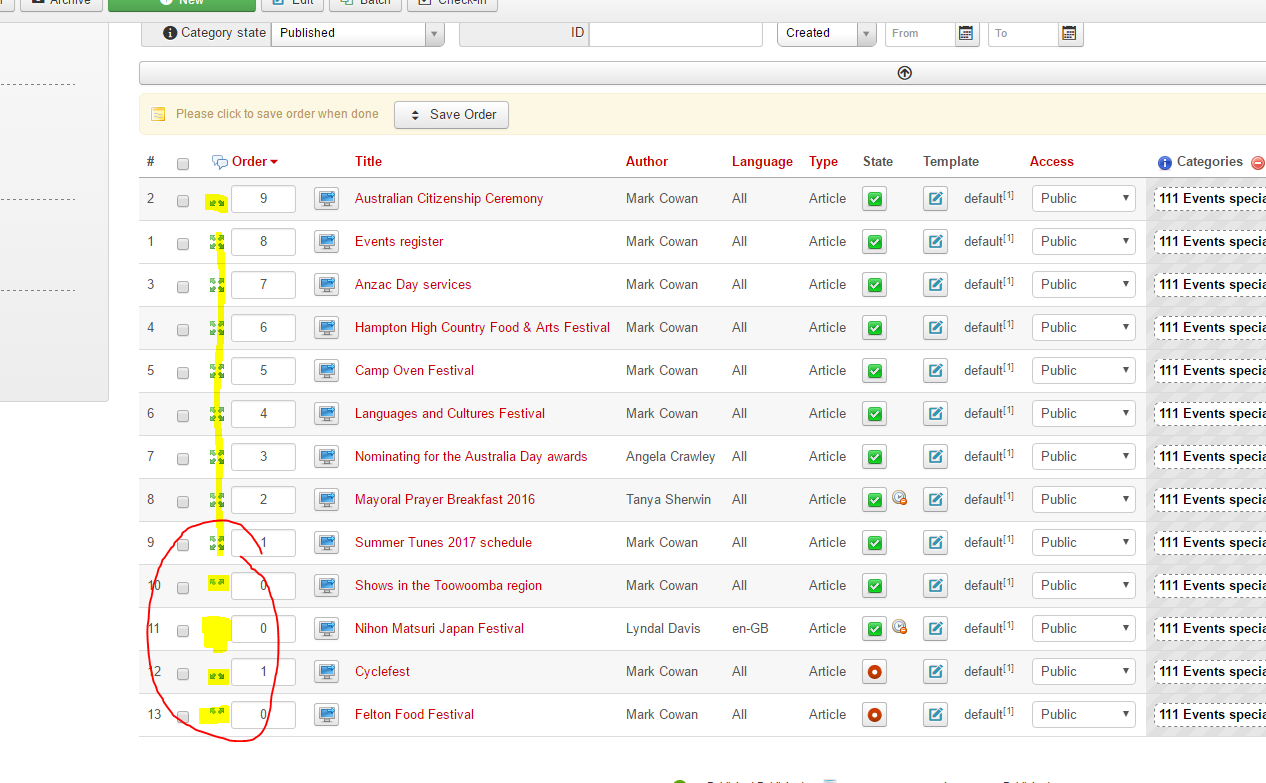 Additionally, filtering by a particular category gives a weird ordering motif that isn't understandable as to the order visualized, this as opposed to the standard Joomla methodology of representing order (in the current context and method).