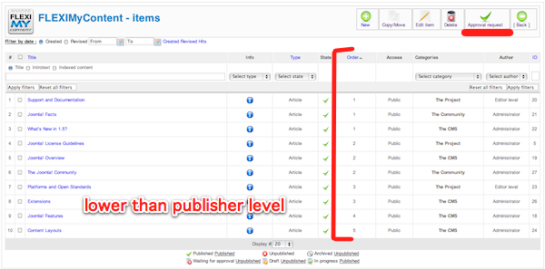 with FLEXImycontent from CMSPlugin.com default it's allow publisher level ordering items on frontend and if you have FLEXIaccess installed you also custom set permission who can order the item. (FLEXImycontent support FLEXIaccess)