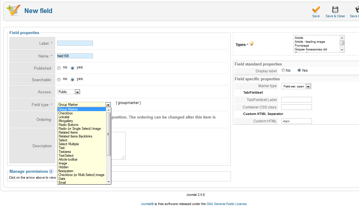 When making a new field it would lead to better usability if the items in the drop down of Field type: * would be listed in an alphabetical order or even better grouped order.