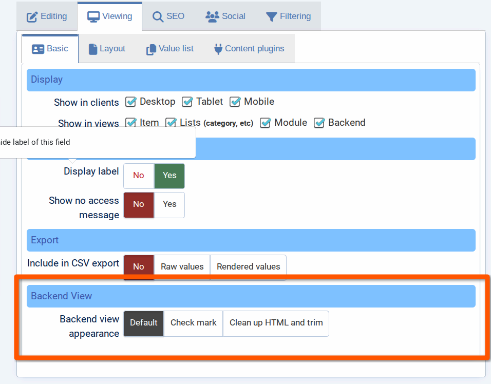 Each field has an override setting "Backend View" in Viewing - Basic tabs.